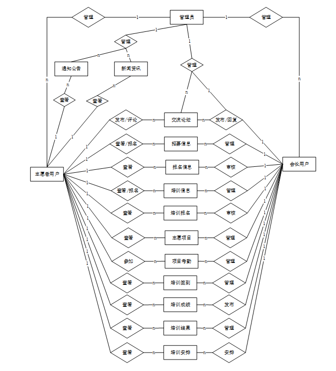 (1)需求分析:深度市场调研与用户访谈揭示了系统需满足的核心需求,包括管理员、会长用户与志愿者用户的活动查询、报名、参加项目、交流论坛、招募报名等管理。各角色功能需求的细致分析为系统设计奠定了坚实基础。