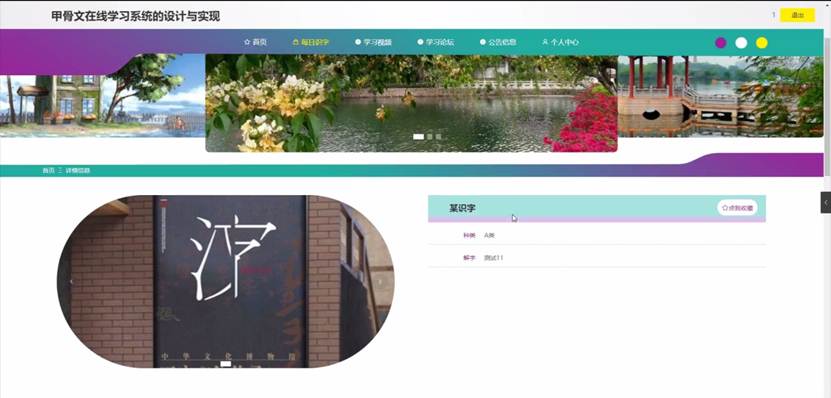 每日识字:在每日识字页面的输入栏中输入识字名称、种类、解字进行查询,可以查看到每日识字详细信息,并根据需要进行收藏操作;每日识字页面如图5-3所示: