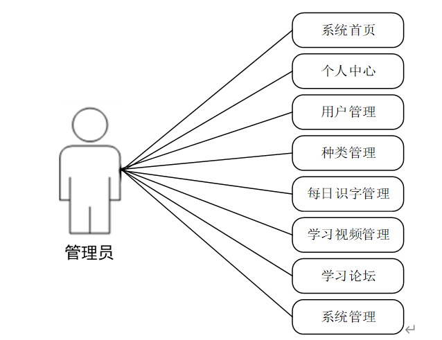 (2)管理员可以对系统首页、个人中心、用户管理、种类管理、每日识字管理、学习视频管理、学习论坛、系统管理等进行基本的信息管理。其用例分析如图3-2所示。