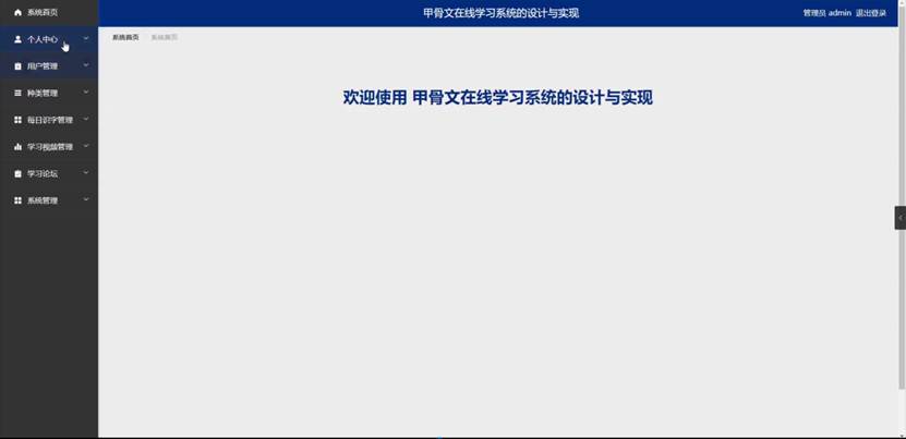 管理员进入主页面,主要功能包括对系统首页、个人中心、用户管理、种类管理、每日识字管理、学习视频管理、学习论坛、系统管理等进行操作。管理员主页面如图5-7所示: