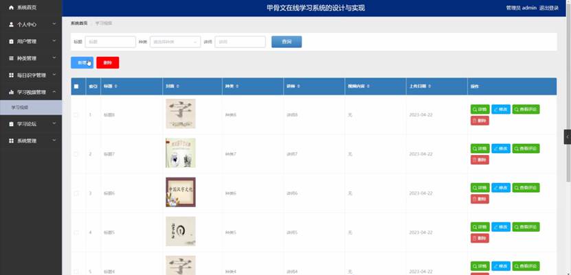管理员点击学习视频管理。在学习视频页面输入标题、种类、讲师进行查询、新增或删除学习视频列表,并根据需要对学习视频详情信息进行详情、修改、查看评论或删除操作;如图5-11所示:
