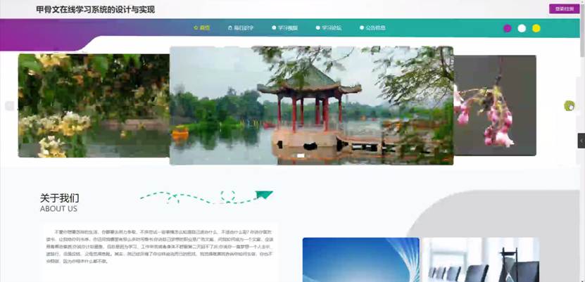 当人们打开系统的网址后,首先看到的就是首页界面。在这里,人们能够看到甲骨文在线学习系统的导航条,通过导航条导航进入各功能展示页面进行操作。系统首页界面如图5-1所示: