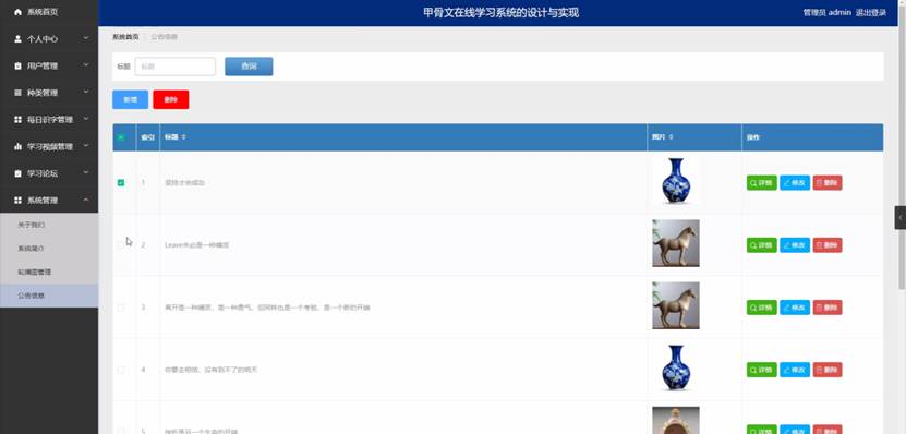 管理员点击系统管理。在公告信息页面输入标题进行查询、新增或删除公告信息列表,并根据需要对公告详情信息进行详情、修改或删除操作;还可以对关于我们、系统简介、轮播图管理进行操作;如图5-13所示: