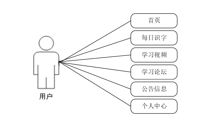 (3)用户可以实现对注册登录、首页、每日识字、学习视频、学习论坛、公告信息、个人中心等信息进行操作,用例分析如图3-3所示。