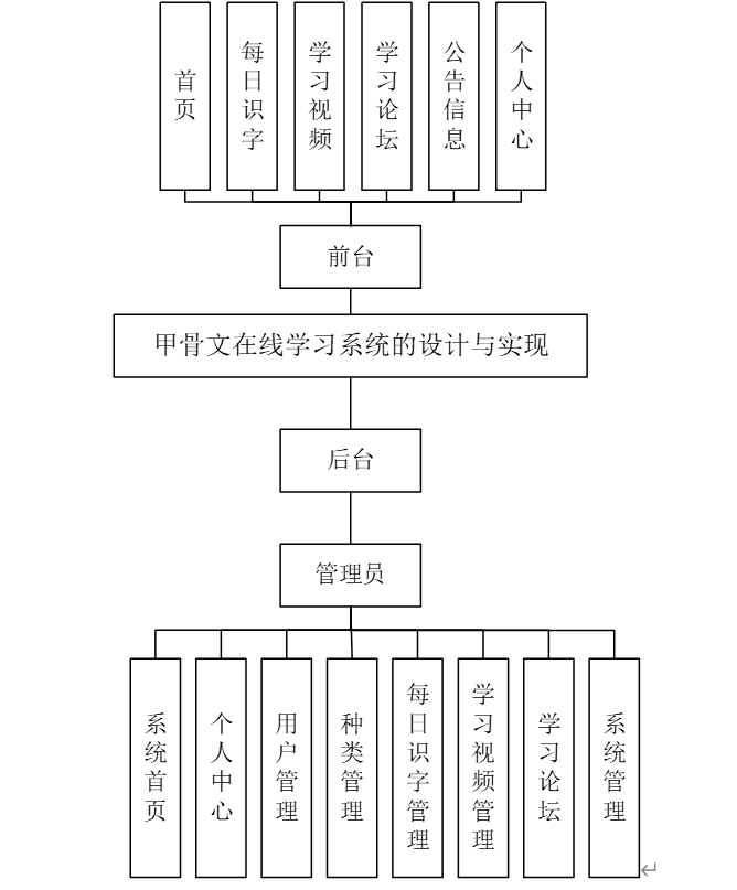 系统核心功能包括个人中心、用户管理、种类管理、每日识字管理、学习视频管理、学习论坛、系统管理等。用户可完成注册登录,更新个人信息,查询每日识字内容并收藏,观看学习视频并参与评论互动,在学习论坛发布帖子交流学习心得,查看公告信息了解学习动态。管理员可对用户信息进行管理,维护识字种类与内容,上传并管理学习视频,审核学习论坛帖子,发布公告与维护系统配置。这些功能覆盖了甲骨文学习的核心环节,实现了学习资源的集中管理与高效共享,为用户提供了便捷的线上学习渠道,也为管理人员提供了规范化的管理工具,契合信息时代的学习发展趋势。