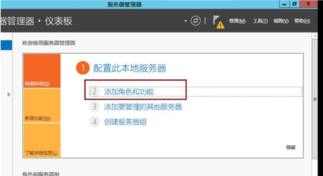 - 打开服务器管理器,点击「添加角色和功能」;