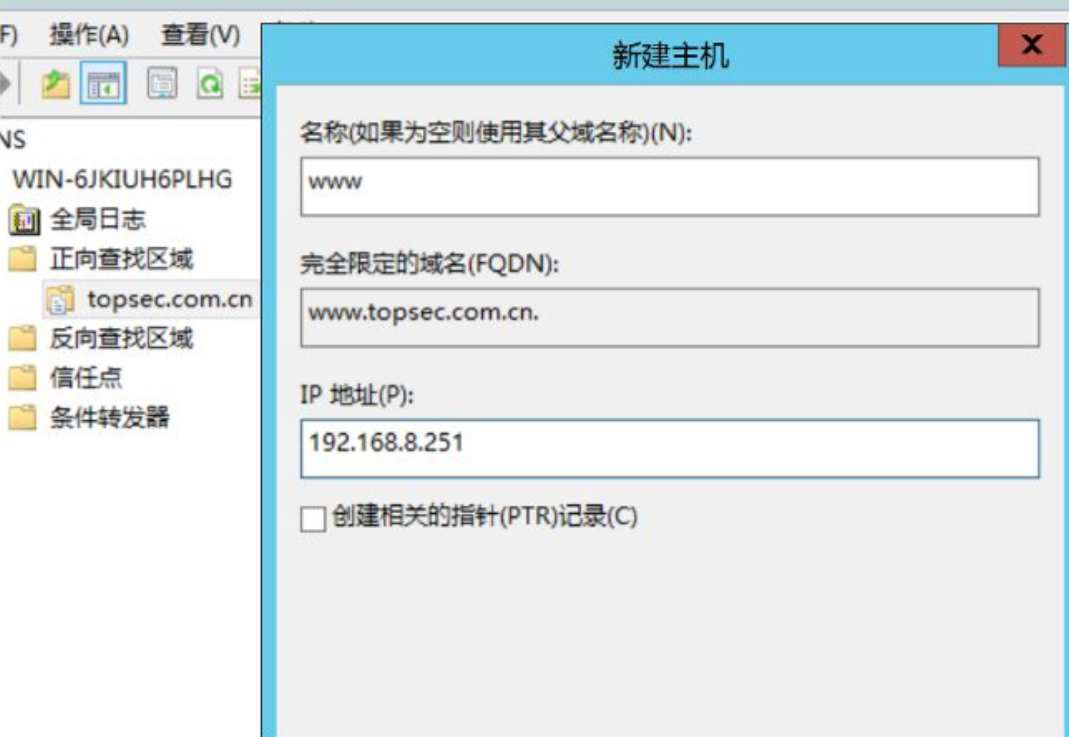 www(域名前缀),「IP 地址」填目标 IP(如192.168.8.251); - 勾选「创建相关的指针 (PTR) 记录」(同时生成反向解析记录,方便后续验证);