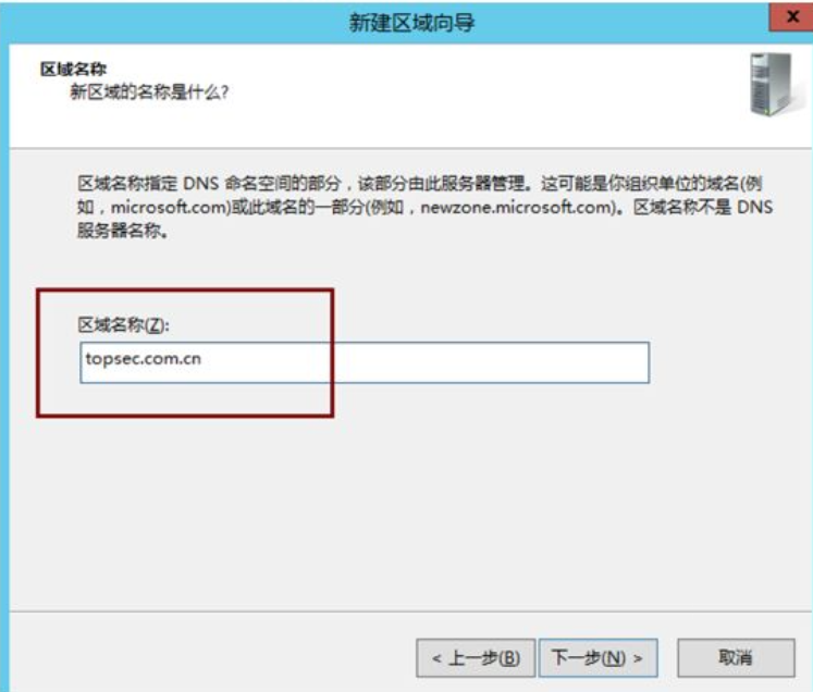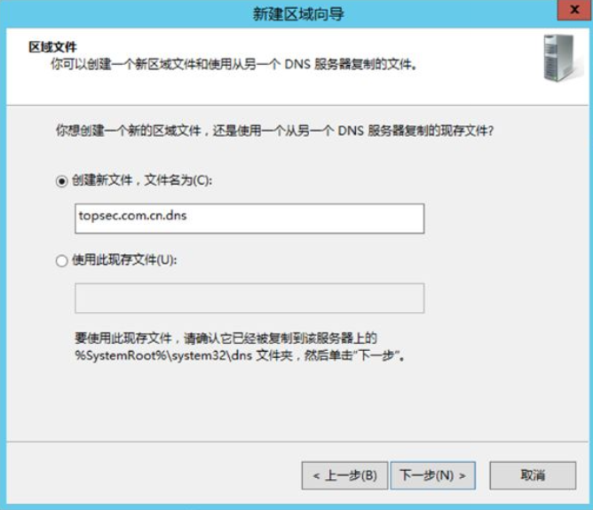 topsec.com.cn,点击「下一步」; - 选择「创建新文件,文件名为 topsec.com.cn.dns」(默认即可),点击「下一步」;