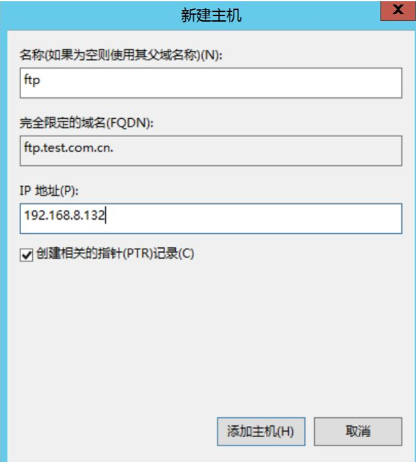 重复上述步骤:「名称」填 ftp,「IP 地址」填另一 IP(如 192.168.8.132),同样勾选「PTR 记录」,点击「添加主机」。