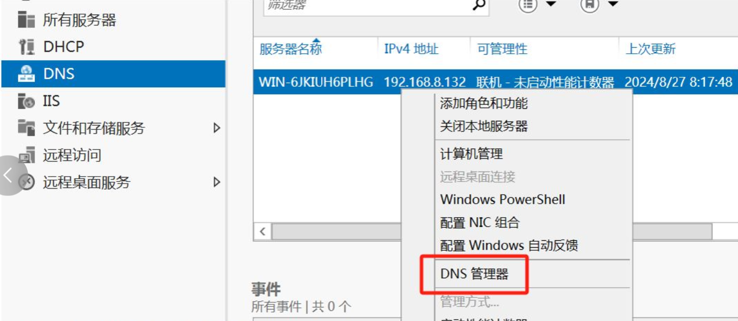 - 打开DNS 管理器:服务器管理器→「工具」→「DNS」;