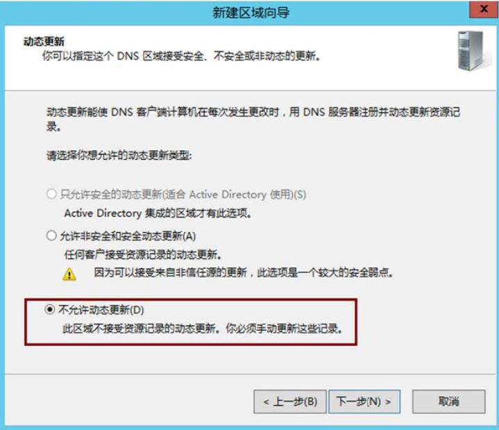 主机 IP 变化时,会自动向 DNS 服务器发送 “更新请求”,修改 A 记录。Windows DNS 支持动态更新,只需在「新建区域向导」中选择 **“允许动态更新”**,并配置好权限(如仅允许特定主机更新)。