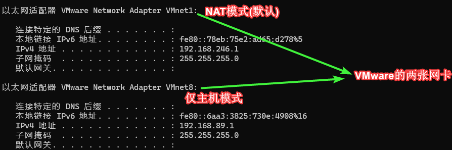 | 仅主机模式 | VMnet1 | 否 | 否 | 192.168.246.1 | 仅可与主机通讯 |