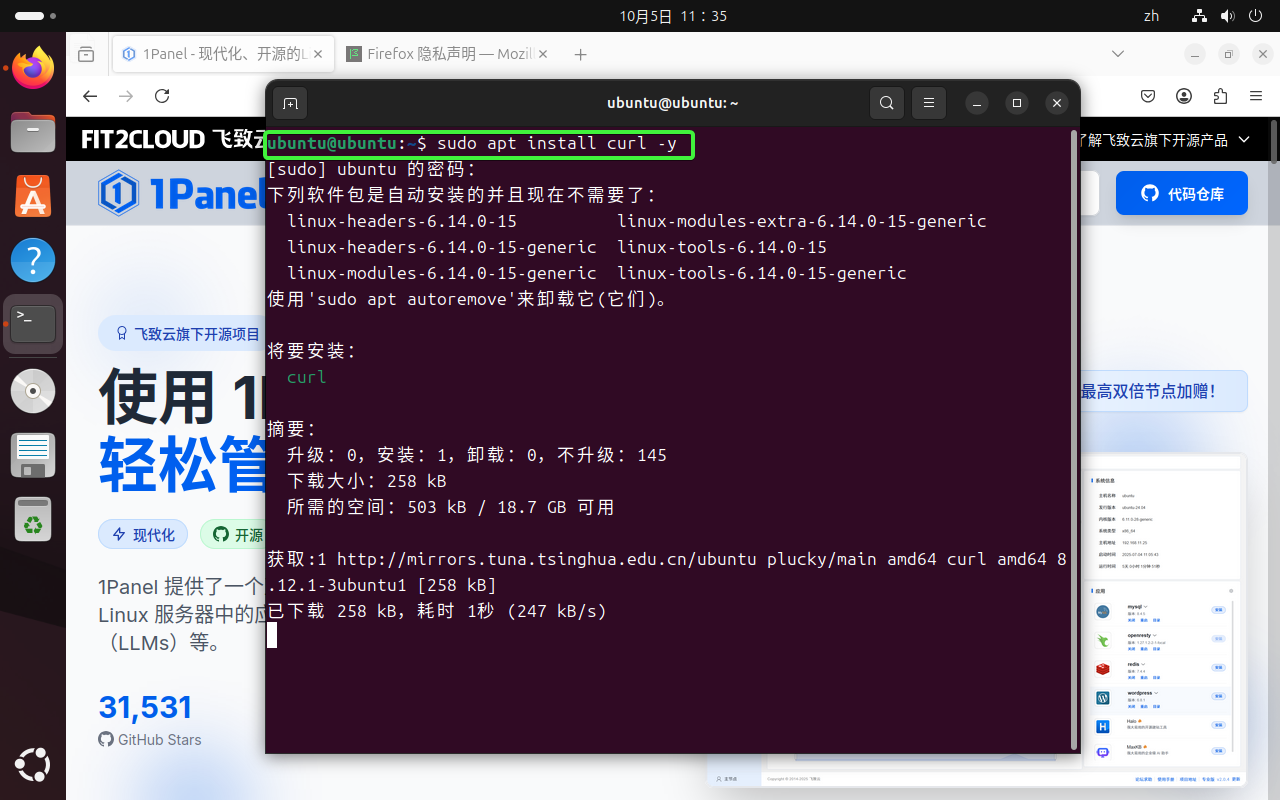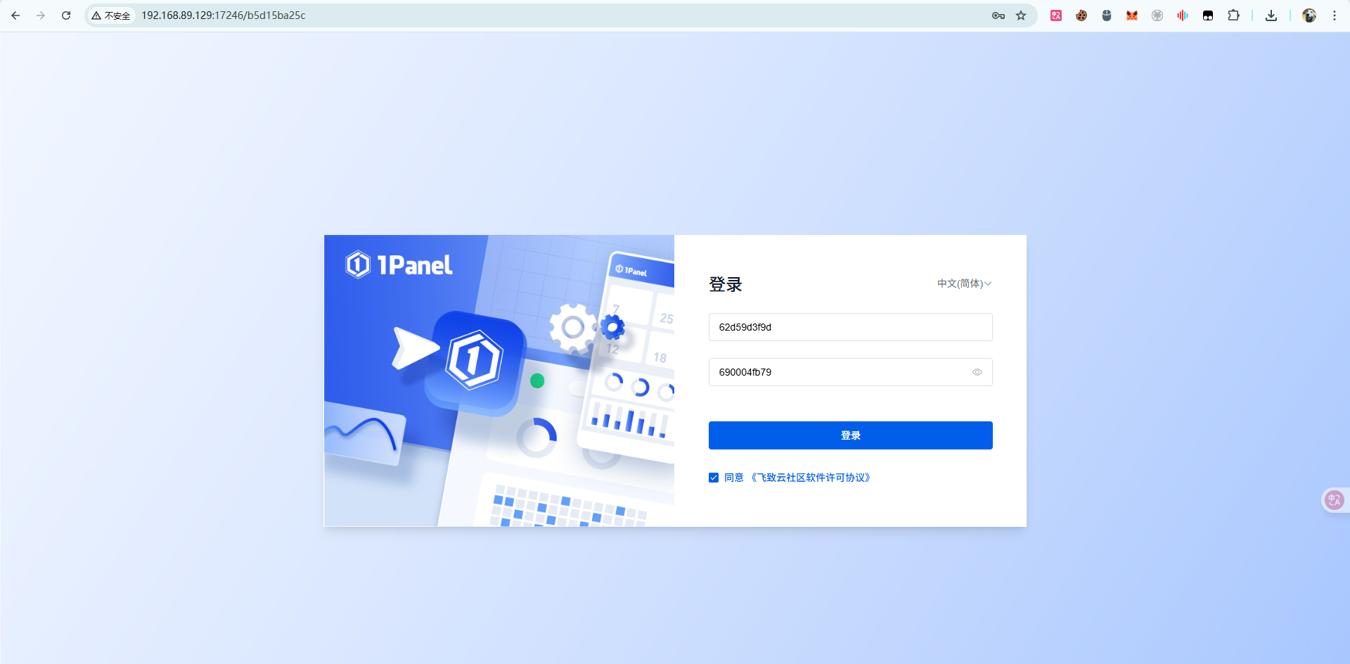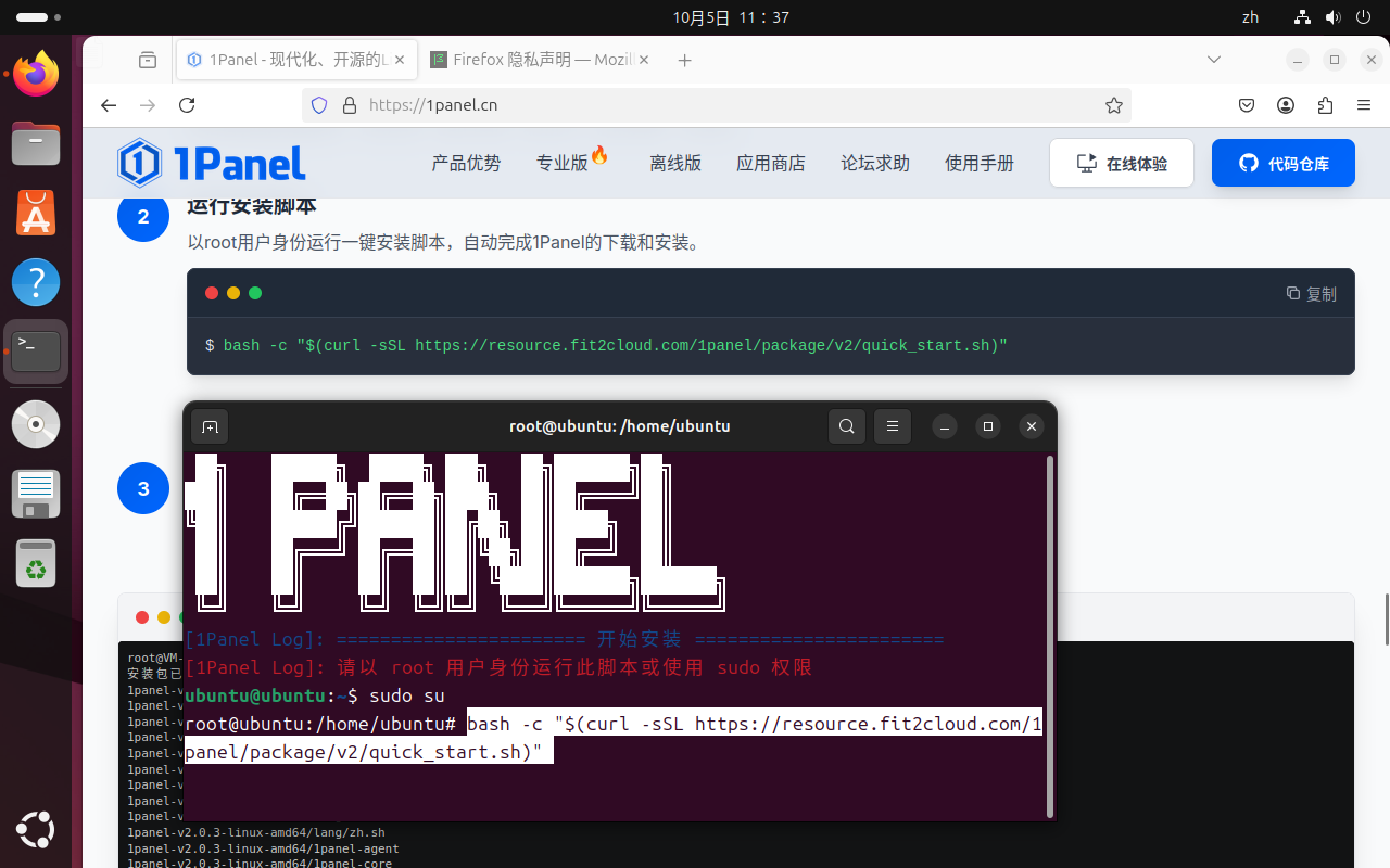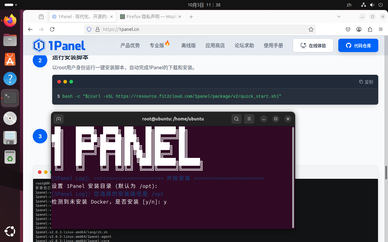 检查:物理机复制1panel网址在ubuntu火狐浏览器打开,如成功即安装成功!