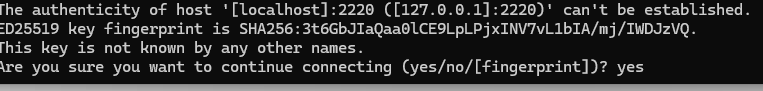 输出上面的信息,说明SSH服务已经启动。并且可以在主机的cmd中通过ssh -p 2220 username@localhost测试WSL端ssh服务是否成功运行: