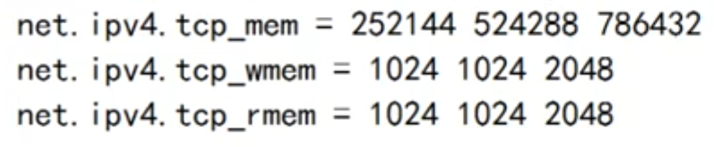 - tcp_rmem:代表接收缓冲区,单位是字节,中间1024代表默认分配缓冲区大小,最大是2048,最小是1024