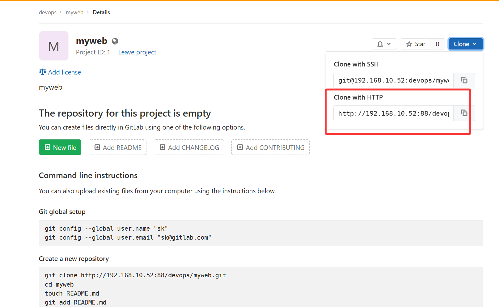 git clone http://192.168.10.23/devops/myweb.git