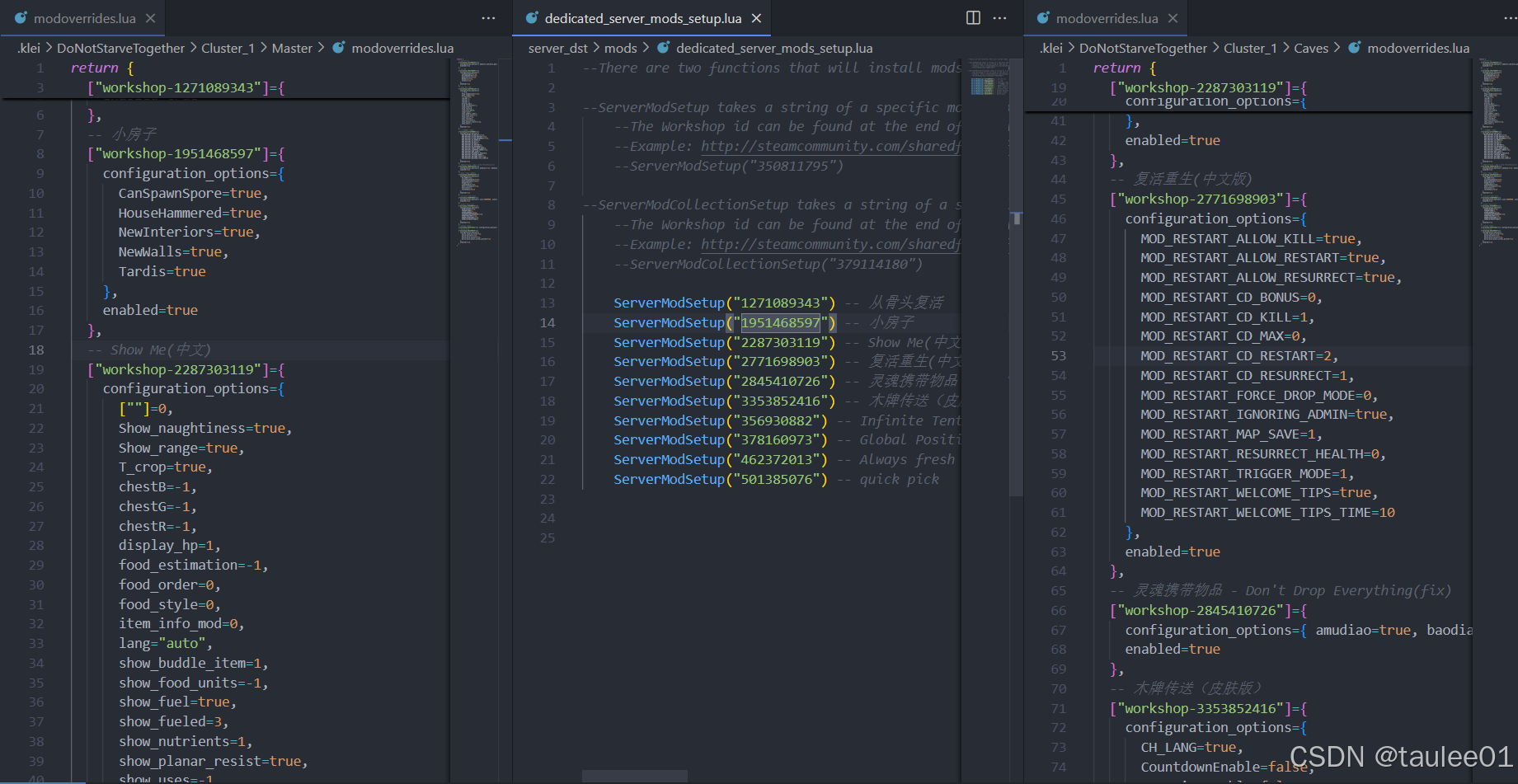 ~/server_dst/mods/dedicated_server_mods_setup.lua这个告诉服务器要下载哪些 mod, 可以后续再选择是否要在modoverrides.lua中启用并设置. 因为 Cluster_1 是从 windows 中复制来的, 现在其为空, 我们要把modoverrides.lua中对应的 mod 写入.ServerModSetup("ID") # ID 就是 modoverrides.lua 中的 workshop-ID #每行一个, 行尾无任何符号 ServerModCollectionSetup("ID") # 下载创意工坊中的 mod 集合. 一般用不到 # 注意到, mod ID 就是 steam mod 的网址中最后的一串数字