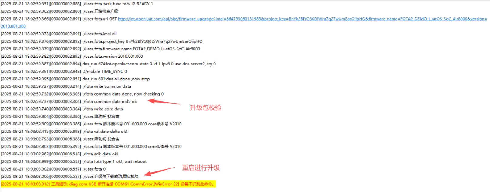 -- 需要注意的是在fota_cb回调函数中,升级包下载成功后,会立马重启并升级模组。如果还有其他事情要做不想立马重启升级,需自行决定reboot的时机
