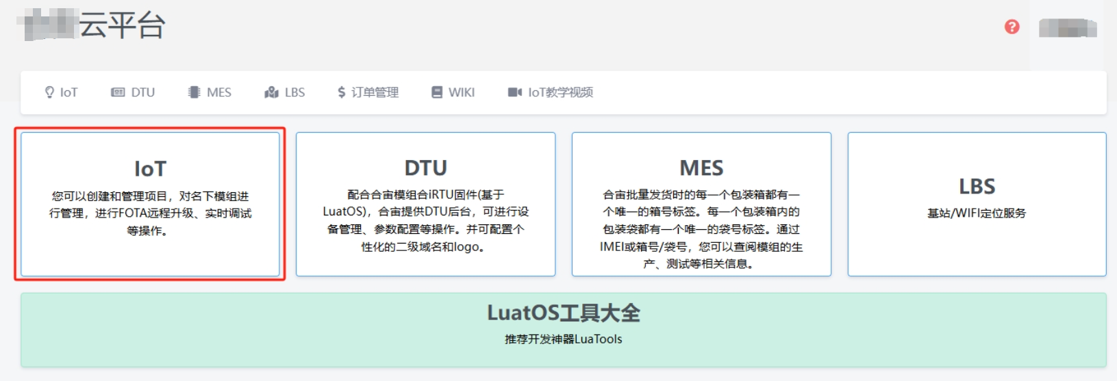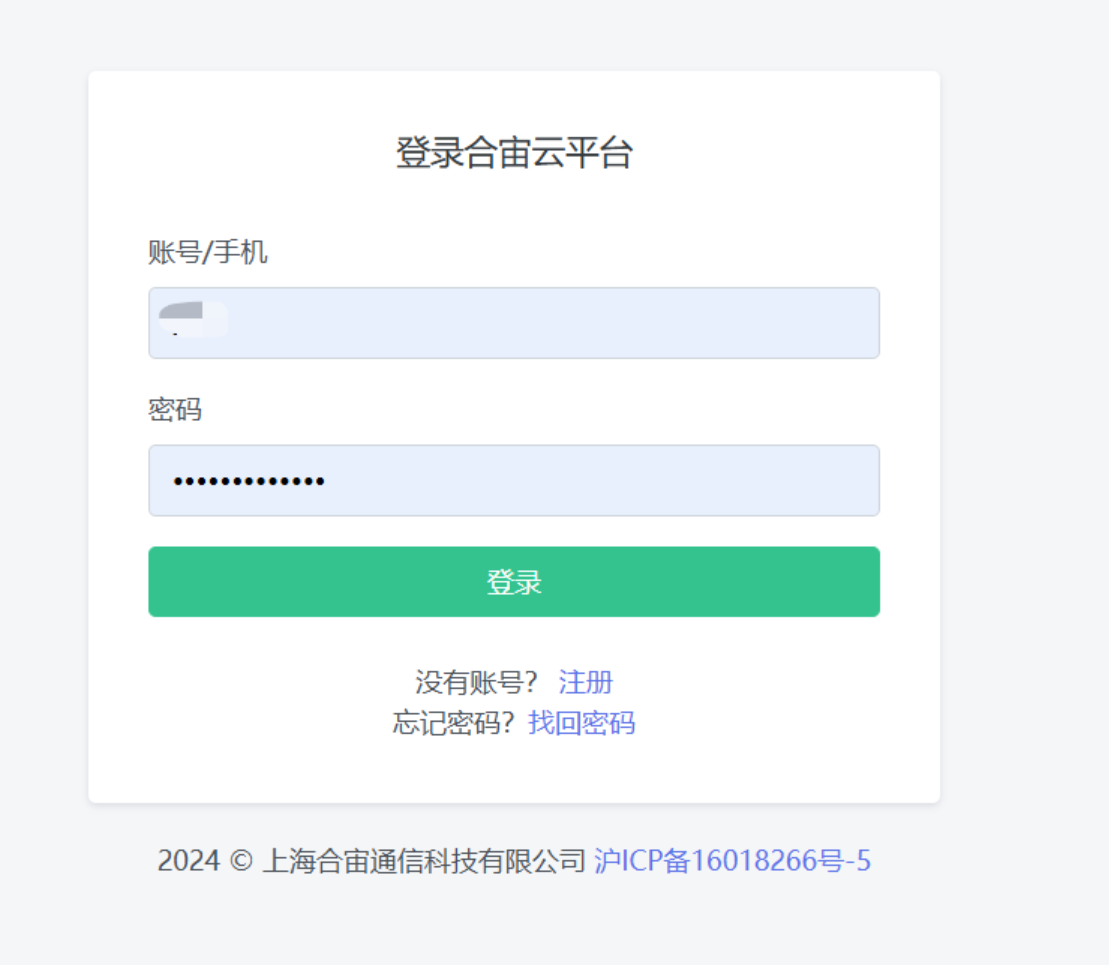 使用合iot服务器的话,需要先登录合宙 IOT 平台,如下图所示,没有账号的,可以先注册一个 客户向合宙采购 4G 模块时,如果采购人员没有告知合宙这批模块放在 iot.openluat.com 上的哪个产品下,则合宙会以采购人的手机号为账号,默认密码 888888,创建一个“合宙标准模块”的项目,此次采购的所有模块都会放在这个项目下,如果你的账号下没有对应 imei,可以联系合宙销售帮忙添加模块进对应项目下(最好还是从哪里买的模块,就让他给你转移到你自己名下)
