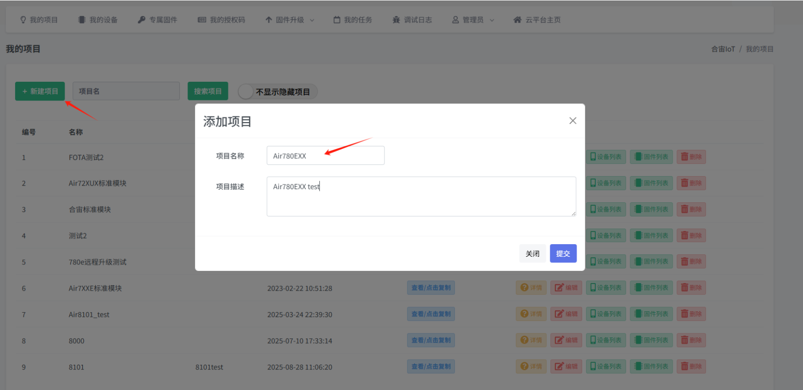 4.打开刚刚的合宙 iot 平台点击我的项目--固件列表--创建固件