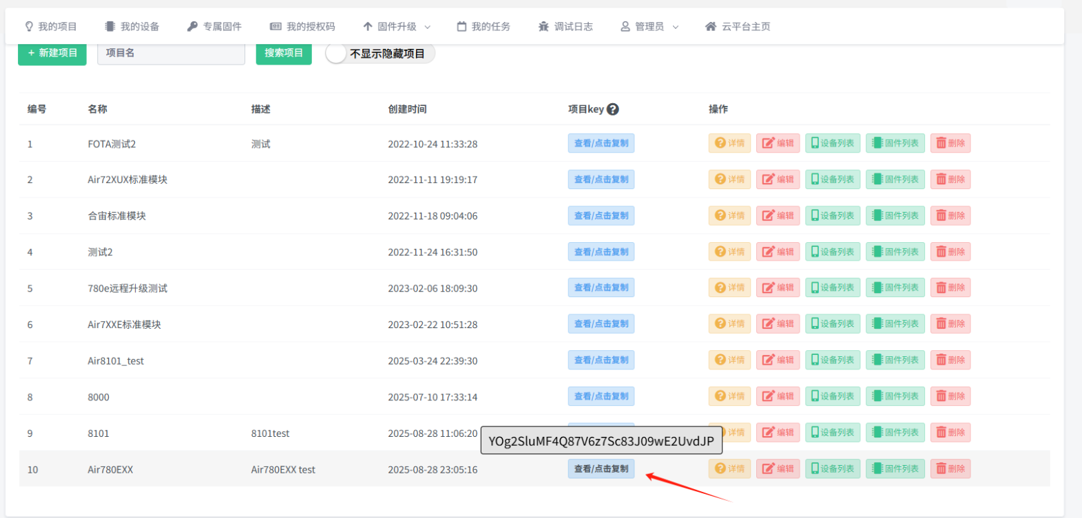 在所有项目的最后,找到自己刚刚新建的项目,并且点击红框内的"查看/点击复制"复制后面升级所需要的校验码,复制到自己剪切板中