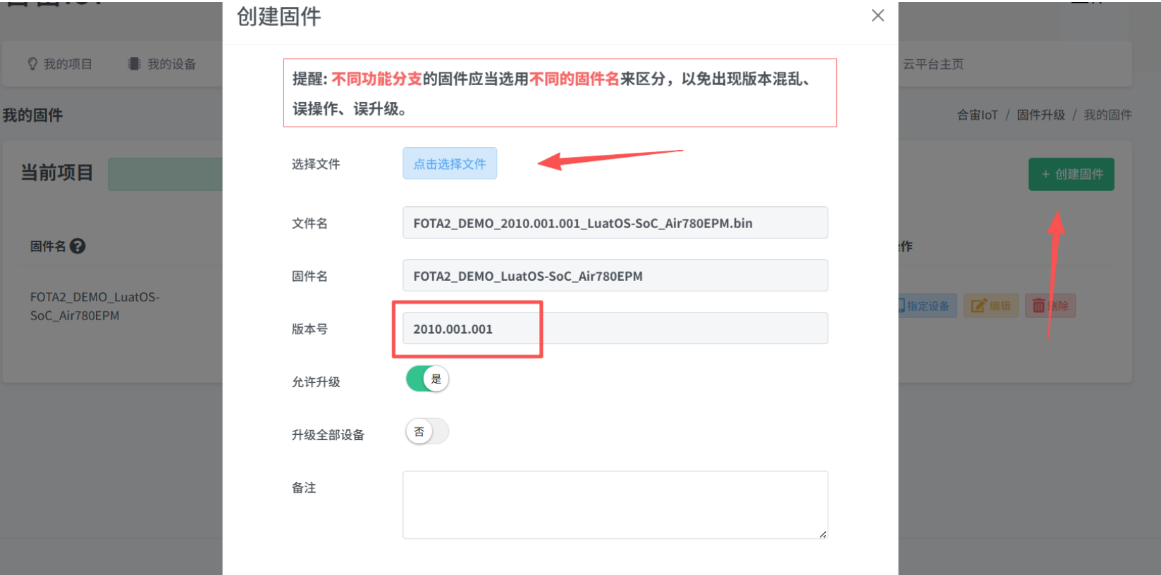 创建固件的时候勾选"升级全部设备",则这个项目下的所有设备都会升级此固件。
