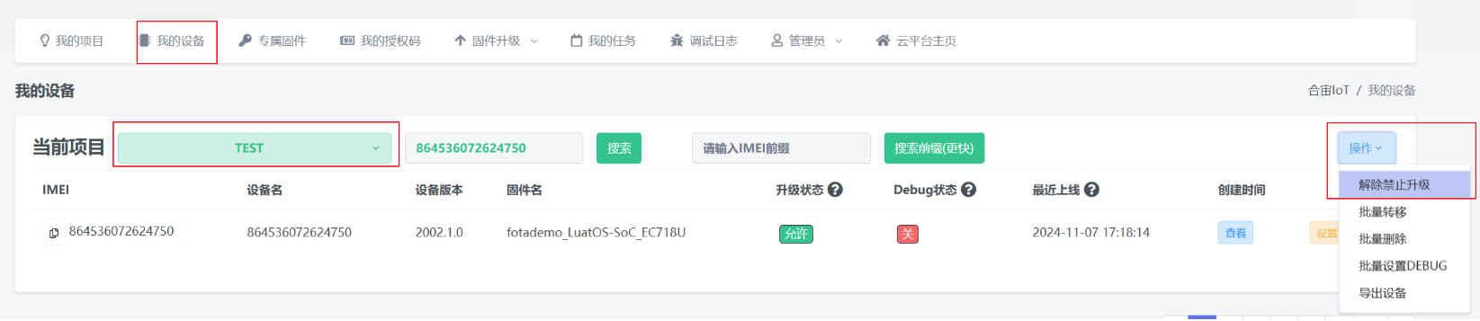 在"我的设备"中选择升级 imei 所在的项目,然后点击右边的"解除禁止升级",