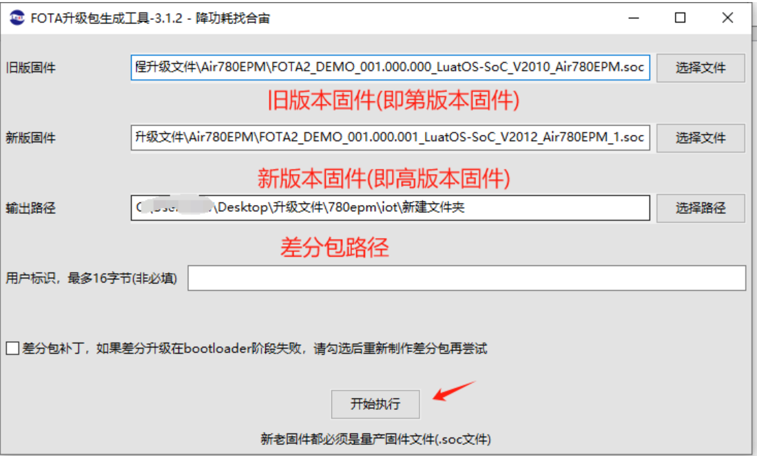 4.按下图所示选择低版本以及高版本的固件,然后点击开始执行即可,如果不想输出的差分包在 luatools 根目录下,可以自行选择一个输出路径