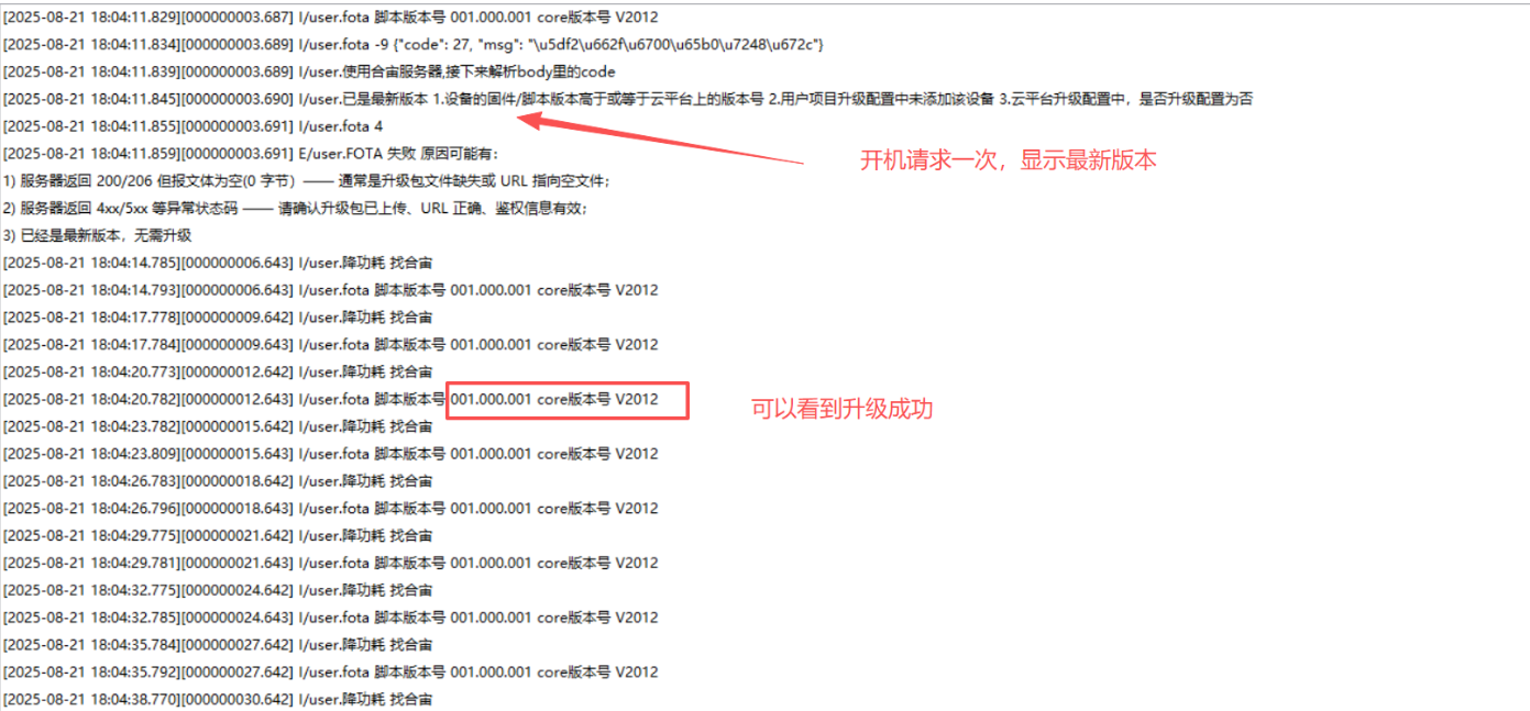注意:升级完成以后,因为脚本中开机有联网就去请求一次升级的代码,所以,会再去请求一次升级,因为没有更高的版本了,所以会上报"已是最新版本"