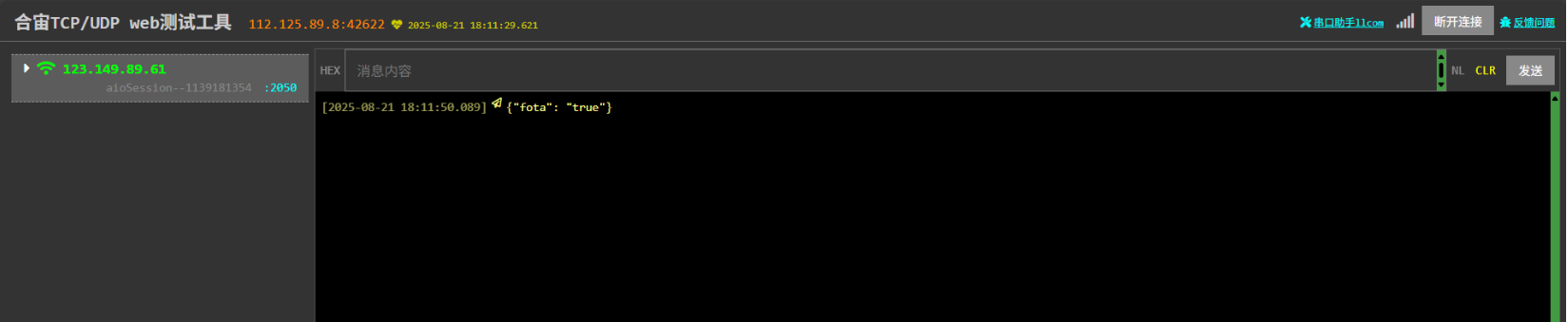 升级前:设备连接到 TCP 服务器,等待指令下发:{"fota": "true"}