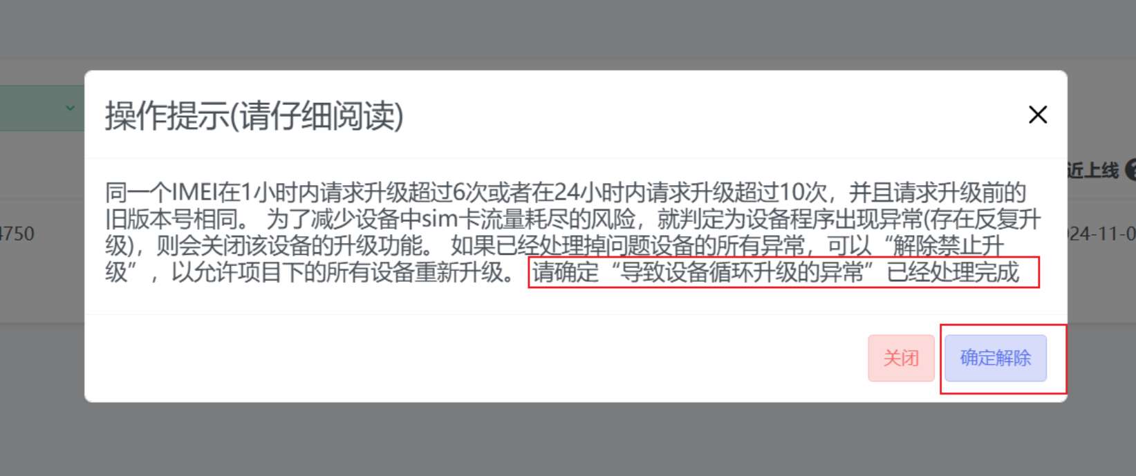 确定“导致设备循环升级的异常”已经处理完成后,点击确定解除,即可解除限制升级