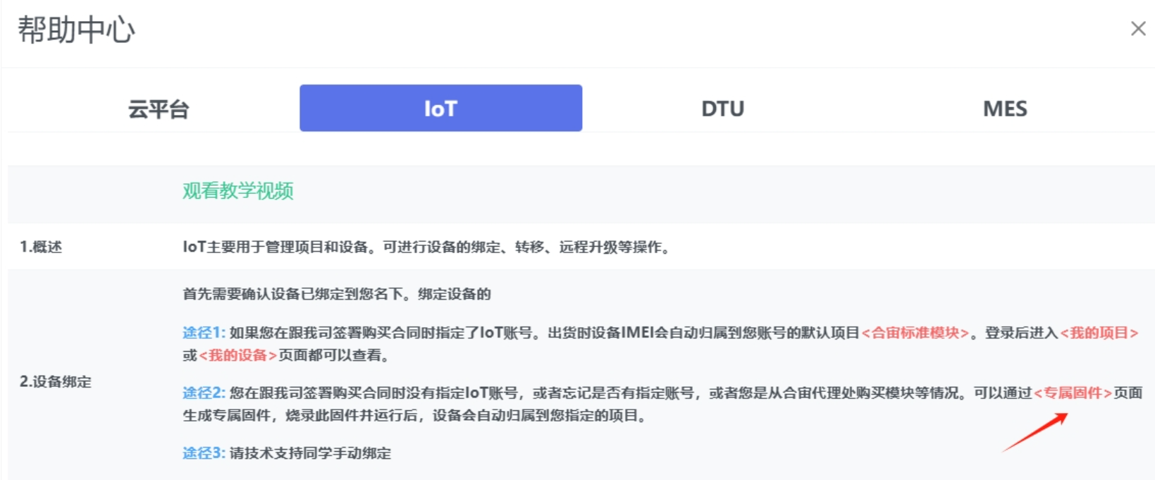 如果不在自己账号下,也可以通过烧录专属固件的方法,把模块归属到您指定的项目下,可以通过点击帮助中心,查看详细说明。