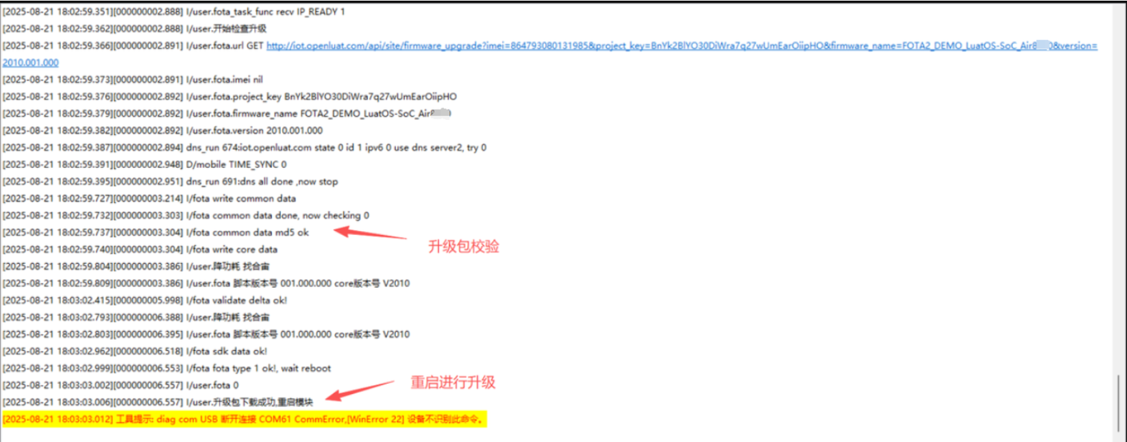 -- 升级包下载成功后,本demo默认是立即自动重启并且将升级包更新到模组中,更新成功后,会再次走到这里