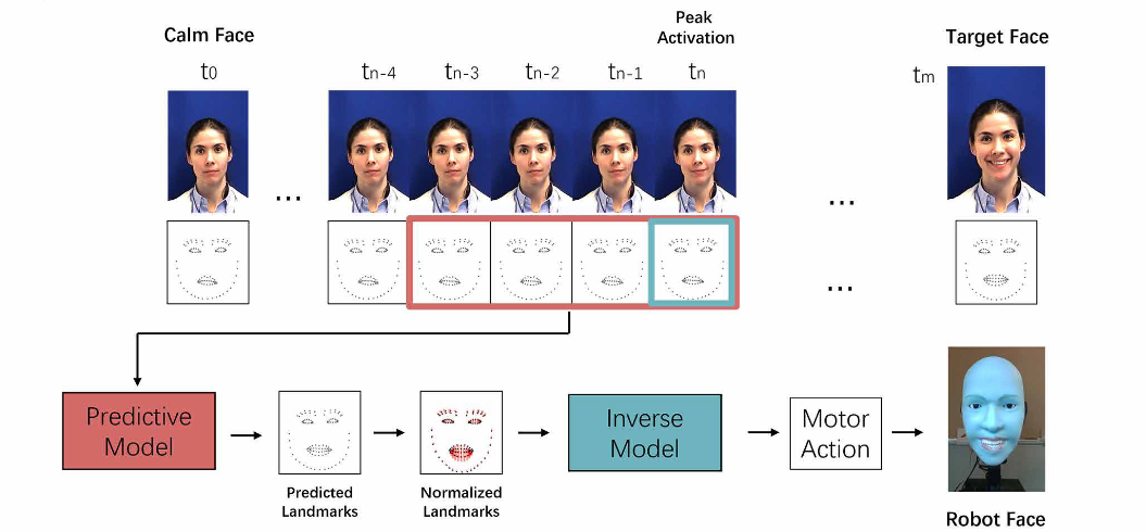传统的机器人表情生成逻辑是“反应式”的:先通过摄像头感知人类笑了→识别表情 →指令驱动电机 → 机器人笑。 这就导致了机器人总是充当“复读机”的角色,笑得比人晚,看着不真诚。