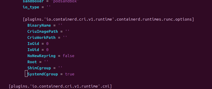 找到[plugins.'io.containerd.cri.v1.runtime'.containerd.runtimes.runc.options]下的SystemdCgroup