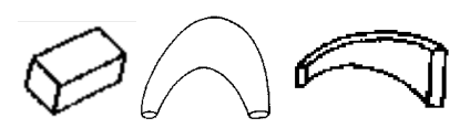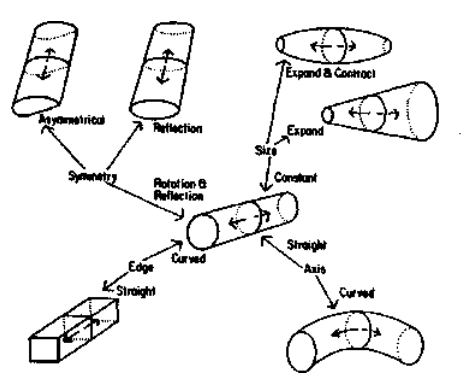 RBC理论的一大贡献是提出了几何子的4种基本属性,并根据这4种基本属性的不同组合整理出36个基本几何子。这四种属性包括三种横截面属性:横截面的边的曲直情况(直边vs弯曲边),横截面的对称情况(镜像对称vs镜像对称且旋转90度后对称vs不对称),横截面面积的情况(面积恒定vs面积扩展vs面积扩展及收缩);还一种轴线属性:轴线的曲直线情况(直线vs曲线)。4种属性的属性值组合起来,其数量为2*3*3*2=36。下面再用三个例子进行说明,图20(a)是一个长方体,其横切面为正方形,因此其横切面的边是直边,镜像对称且旋转90度后对称,面积为恒定,其轴线为直线;图(b)的横切面是椭圆形,因此其边是弯曲边,镜像对称(如果横切面为圆形,那么对称情况为镜像对称且旋转90度后对称),面积为扩展及收缩,其轴线为曲线;图(c)横切面(长方形)的边是直边,为镜像对称,面积为扩展,其轴线是曲线。