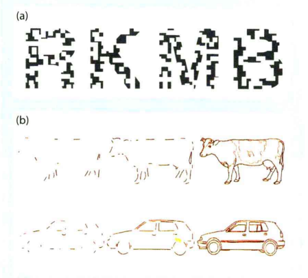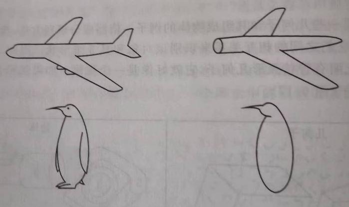 Biederman发现,一个物体只需呈现少量的几何子,我们就能识别它。这与我们生活中的经验相符,即当物体发生遮挡时,我们仍然能够识别它。如图19,右方的图片即使缺少了部分几何子,但是仍然能被正确识别为左方的飞机和企鹅。