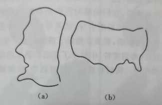 图形的方向对识别有重要影响。方向需要在参照系中进行讨论,那么影响图形识别的方向属于什么参照系呢?有研究认为,对感知起关键作用的并不是视网膜上形状的方向(但如果图形以视网膜为参照系定向,那么当图形在视网膜坐标上转动时对图形的知觉应该会改变(被规定好的顶部、底部和两侧的方位会重新根据视网膜定义)),而是形状相对于重力和周围背景如何定向,这被称之为环境定向(Rock,1973)。即如果一个图形的方向仅在视网膜坐标上被改变,那么这个图像不会出现识别或判断上的改变(被规定好的顶部、底部和两侧的方位不会随视网膜位置改变而改变)。图24表现的是方向与周围背景的另一个作用效果(周围背景),在上面和在下面的两个处于内部的小图形具有相同的视网膜方向,但它们的环境(外部矩形)方向不同,造成的结果是上面的图形被看成一个正方形,而底部的图形像一个菱形。如图25(a)的形状一旦被看作是直立的头像,顶部和其他位置就被规定好了,那么把头部向右侧倾斜90°,仍然被感知为一个有胡须的头部剖面图。同样地,看看图(b),如果把它看成是一副美国地图,其顶部等就被规定好,此时把它向左倾斜 90°,其结果仍然是感知到一幅美国轮廓地图。