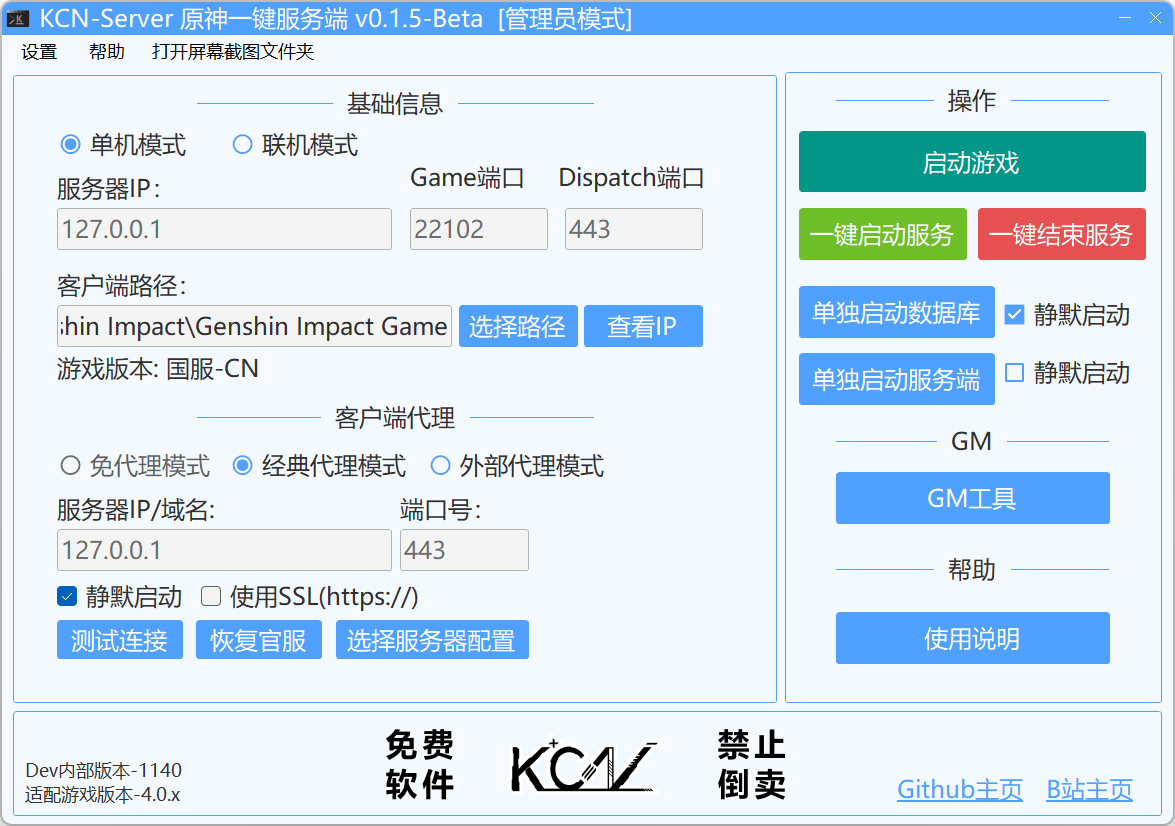 - 启动主程序:运行KCN-GenshinServer.exe或对应平台的可执行文件
