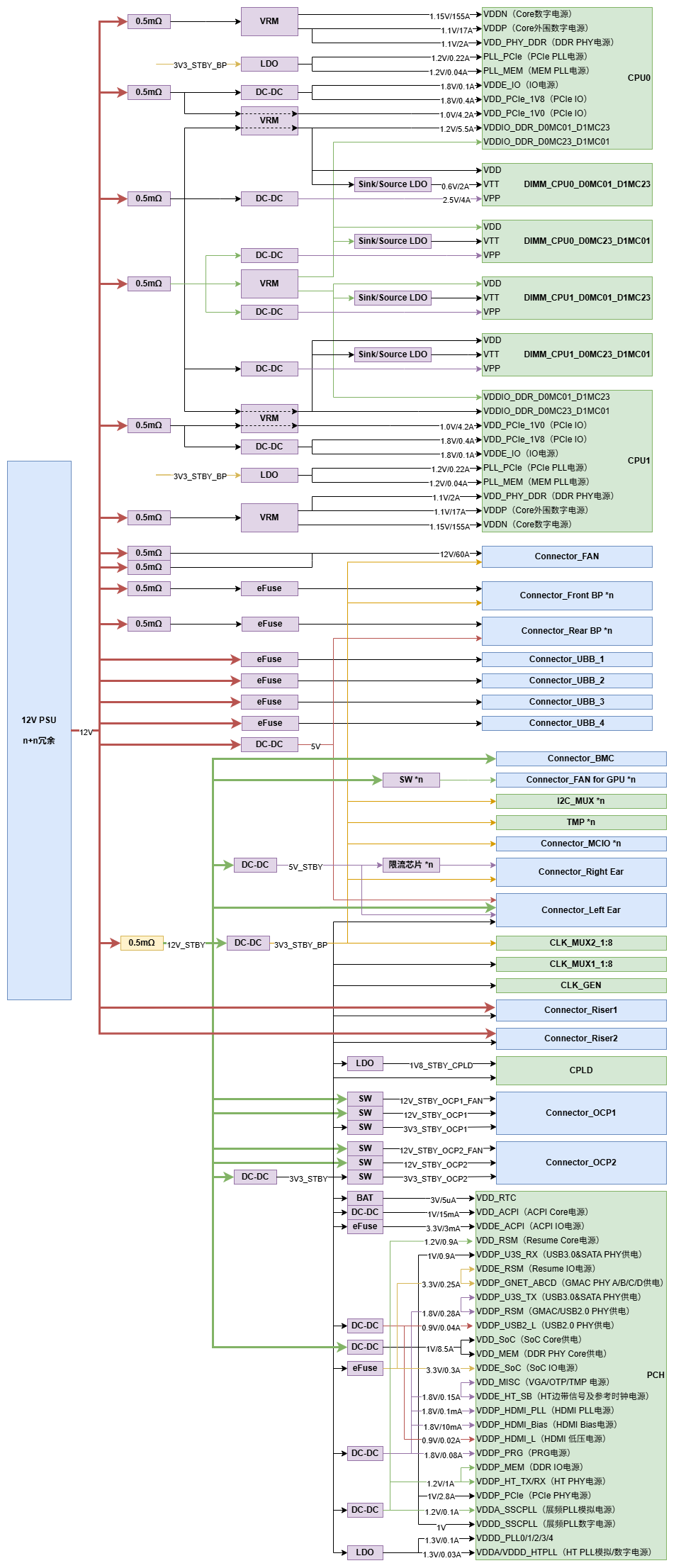 单板完整的电源分配网络拓扑图,展示了从输入电源到各功能模块的转换与分配路径,详见文档的电源架构章节