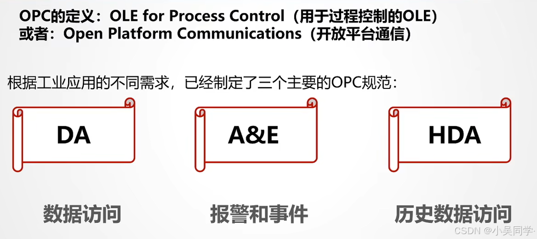 由于软件人员不懂硬件,那么如果想要操作硬件设备就很困难(同时每个硬件还 适用不同的协议)。所以发明了OPC通信协议,统一规定OPC客户端向OPC服务器的请求过程,以及OPC服务器相关的通信接口,让软件人员能方便地操作硬件设备。