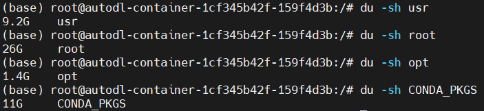 排查结果为只有这四个文件比较大,/usr/最好不要动,/root/里面是/miniconda/占的空间为主,可以清理,/opt/里只有/nvidia/也不能删,/CONDA_PKGS/需要处理。