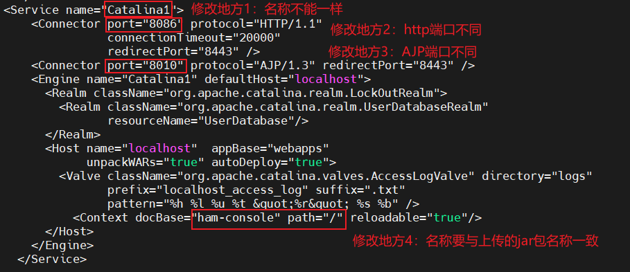 最后是Context的配置:它定义了一个名为 ham-file(这个要与上传的jar包名称一致) 的Web应用程序,其访问路径为根路径("/"),并且开启了“自动重新加载”功能。Context 是Web 应用的具体配置,它将一个 Web 应用映射到一个 URL 路径上,docBase用于指定 Web 应用的物理路径,path用于指定浏览器访问时的路径名,reloadable用于指定是否自动重载。