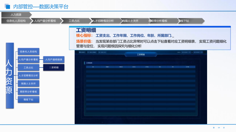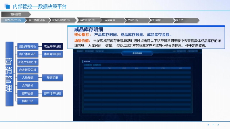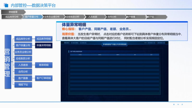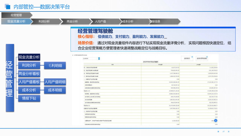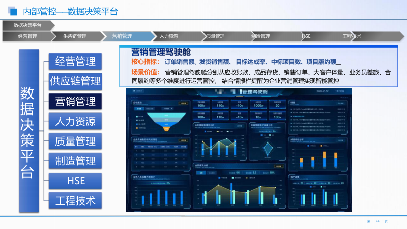 - 研产供销服一体化数据决策平台:秉持精益管理理念,整合研发、生产、采购、销售、服务全流程数据。实时监控各环节投入产出比,定位问题根因并定向改善。核心指标有产能负荷率等,支持数据下钻分析,如成本分析模块定位成本异常点。