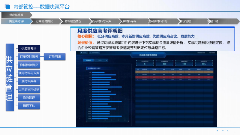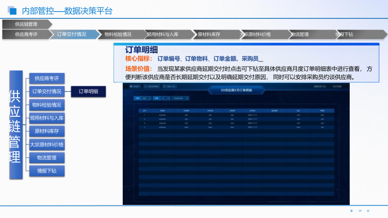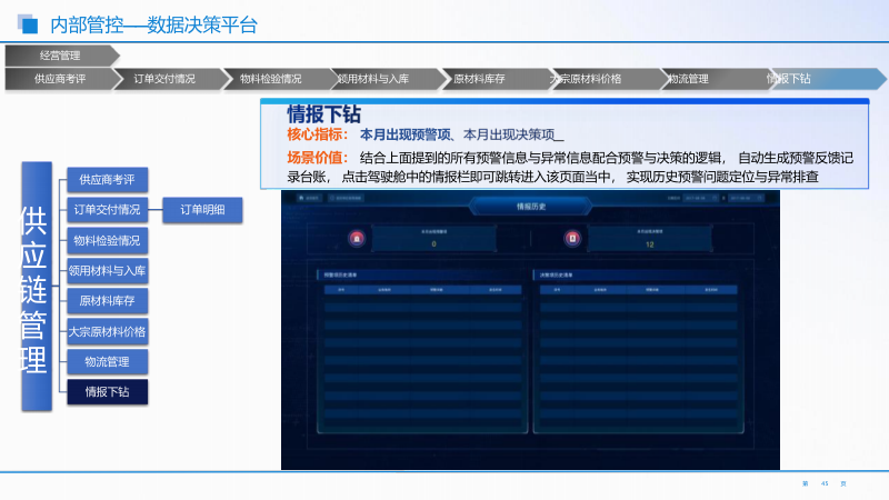 - 供应链协同监控体系:运用 PDCA 闭环管理思维,覆盖计划下达到反馈调整全流程。重点监控供应商考评、订单交付、物料库存等,实现供应链协同与风险管控。