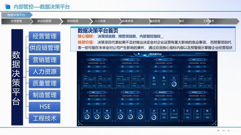 - 综合运营管控中心:整合生产、质量、HSE、人力资源等模块数据,构建实时监控看板。如生产模块监控设备 OEE 等,实现异常实时预警。