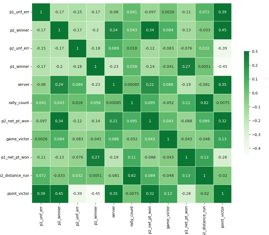 非受迫性失误 (p_1 ext{unf_err}, p_2 ext{unf_err}):这些特征与得分结果显示出显著的相关性,意味着球员的错误可能对得分结果产生至关重要的影响。