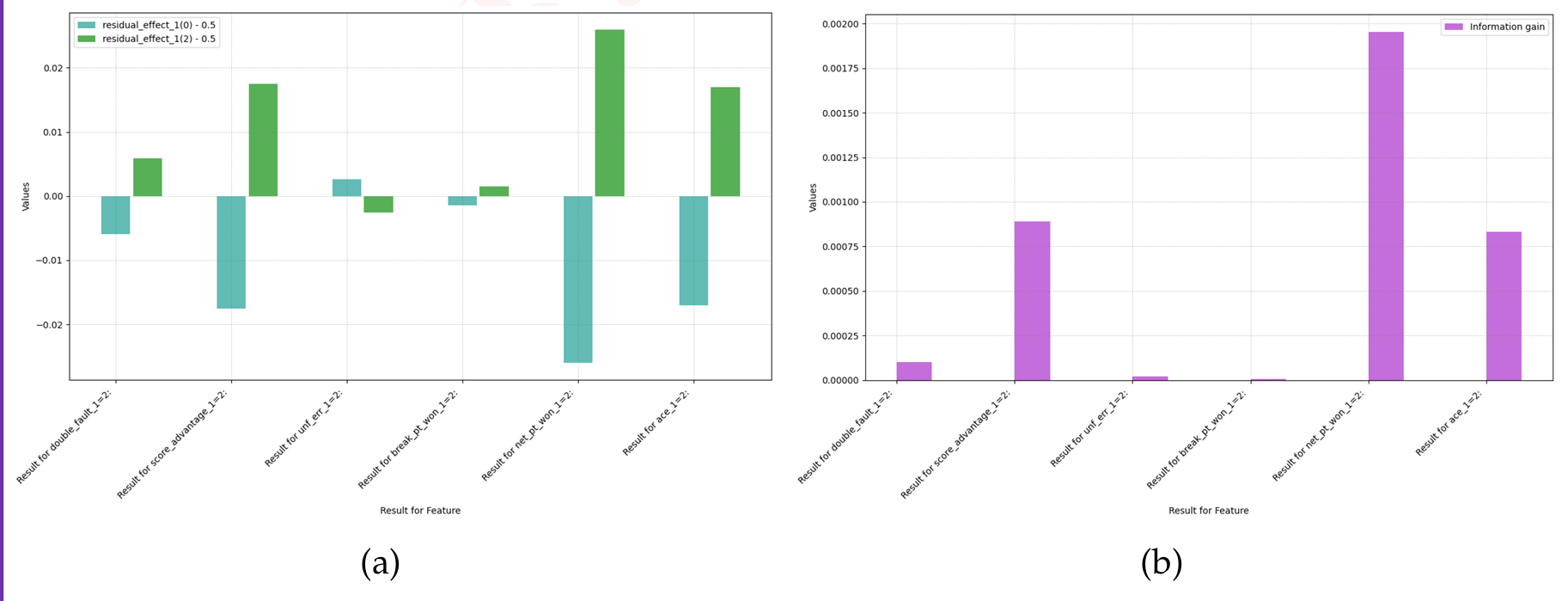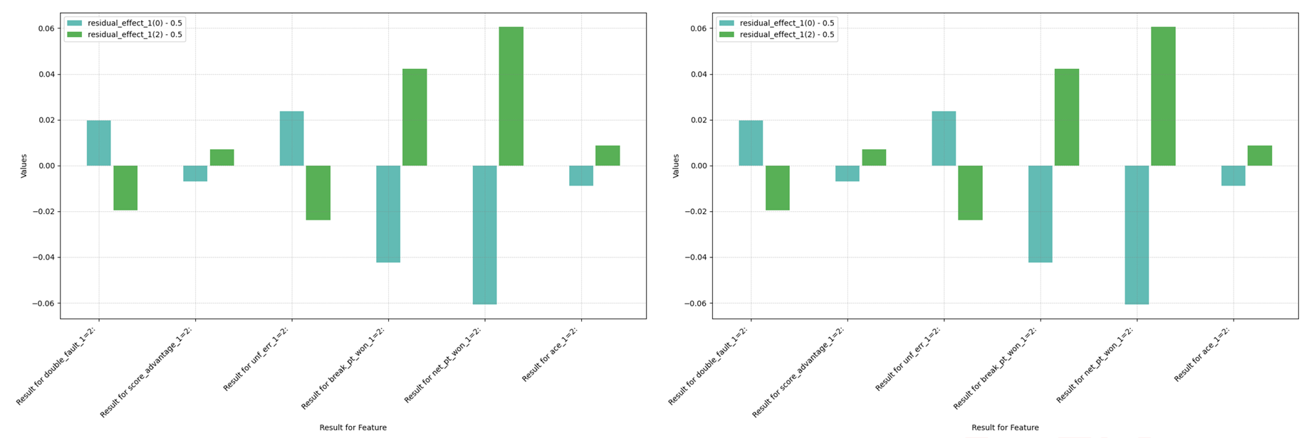 与图 12 相比,一个显著的区别是 Ace 球的影响。在我们的数据集中,男性球员有 9.14%9.14% 的可能性发出 Ace 球,而女性球员只有 4.25%4.25%。此外,双误的发生现在明显有不利影响,因为它不再是试图发出 Ace 球的进攻性尝试的结果。