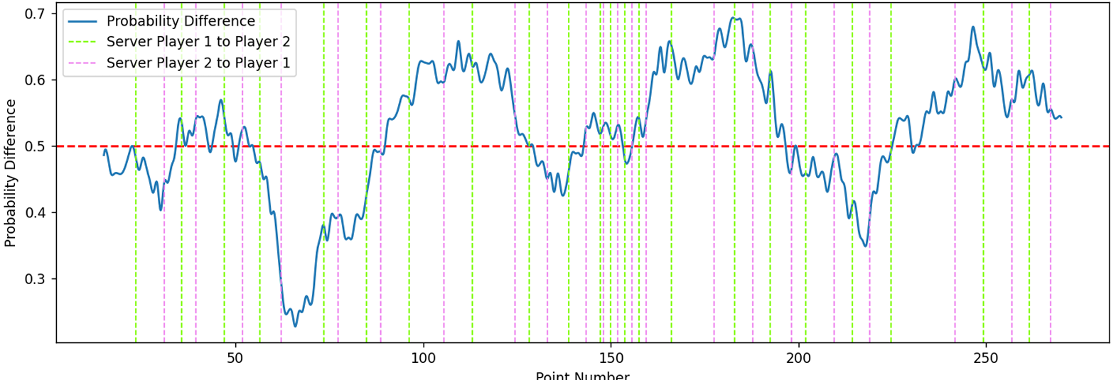 从图中可以看出,对势头最显著的正面影响来自球员的网前得分,其次是 Ace 球和保持领先优势。这些结果表明,积极主动和进攻性的打法对球员的势头有显著贡献。与此形成鲜明对比的是,非受迫性失误被证明会削弱势头,强调了在球场上保持心理优势时稳定性和失误管理的重要性。双误出人意料地似乎略微增加了势头。我们怀疑这是由于双误与进攻性发球之间的相关性。由于球员的进攻性未被识别为我们模型中的变量,因此真正的因果效应很难被学习。