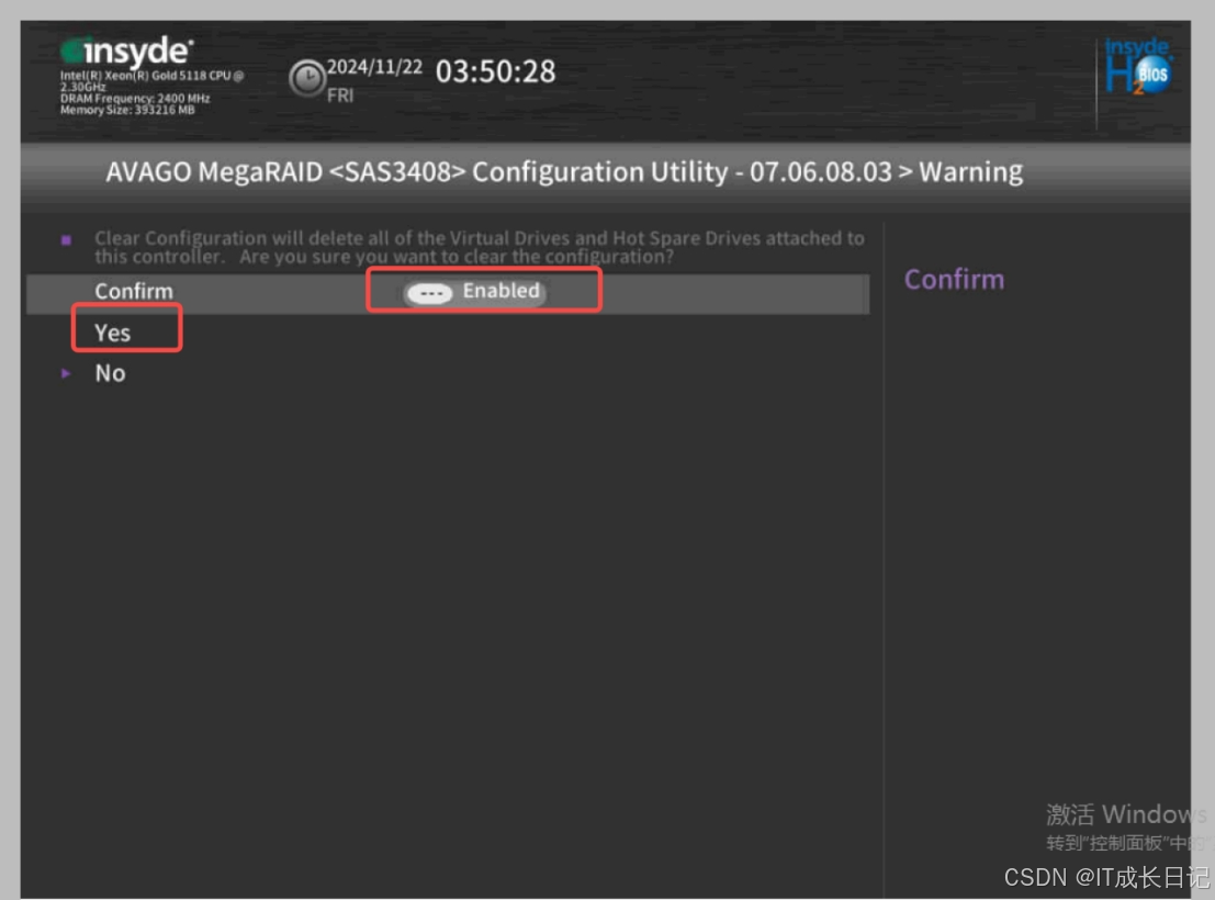 7.按Enter键,选择:Enabled,再按Enter键,选择:Yes,按Enter键